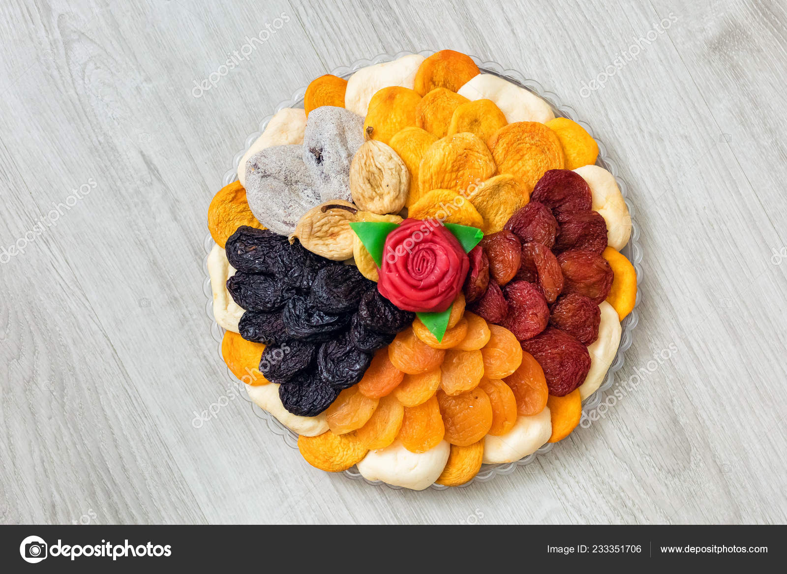 Plate Dried Fruits White Wooden Background Decorative Plate