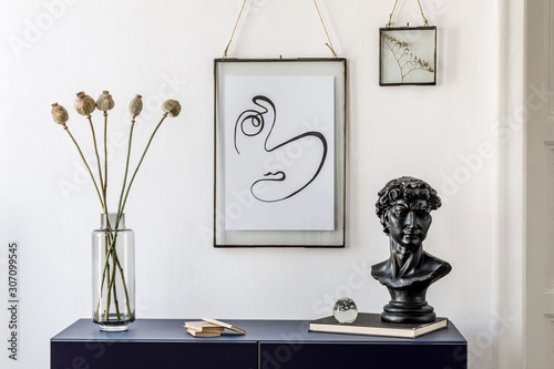 Stylish Scandinavian Living Room With Mock Up Poster Frame Navy