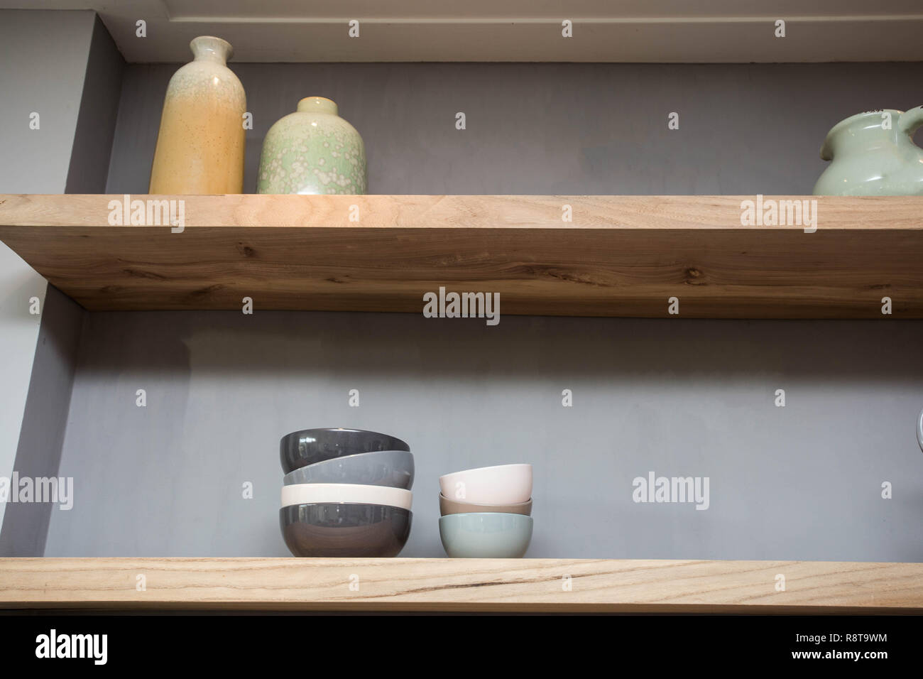 Home Decor Various Neutral Colored Vases Wooden Shelf Against