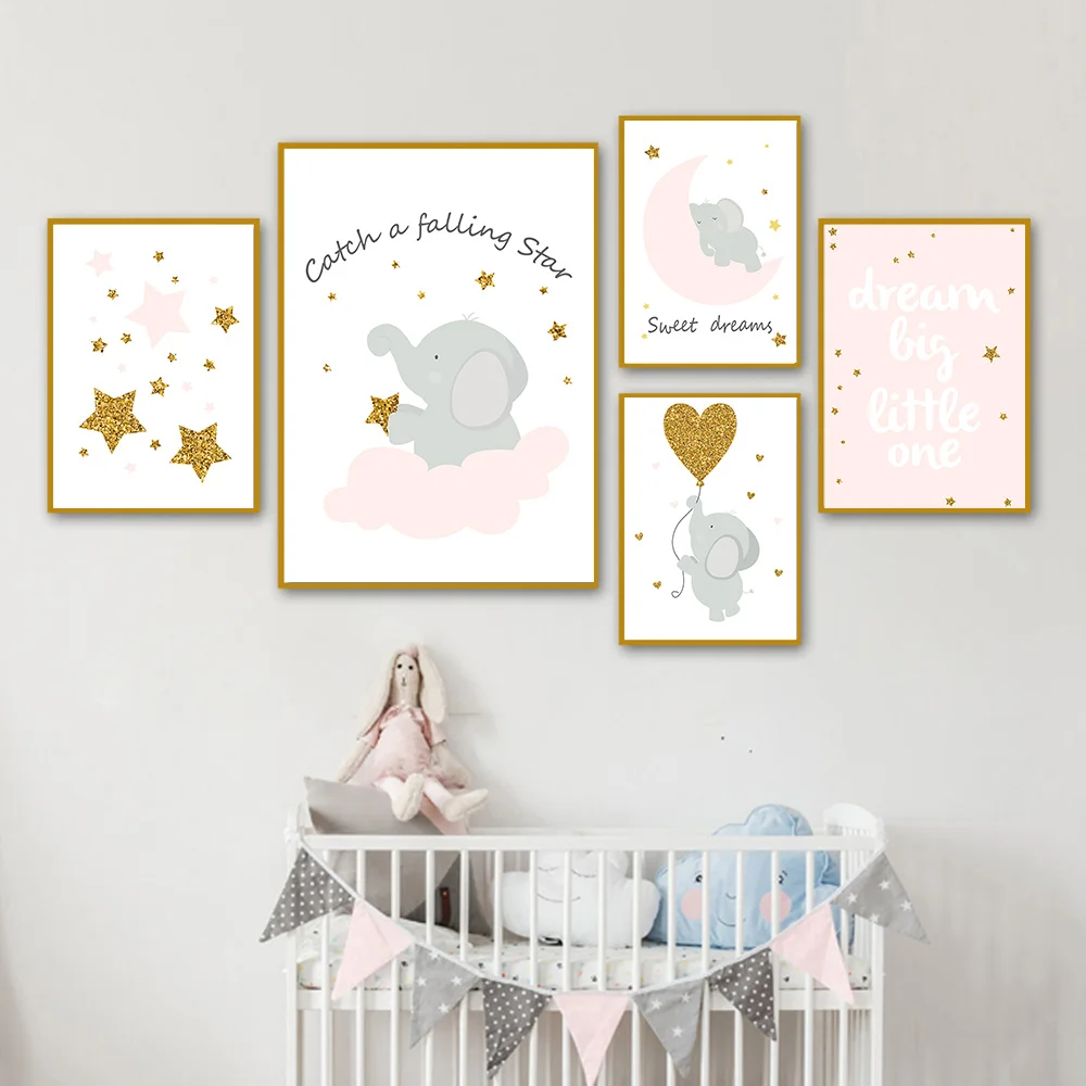 Pink Elephant Star Canvas Children Poster Print Baby Girl Nursery