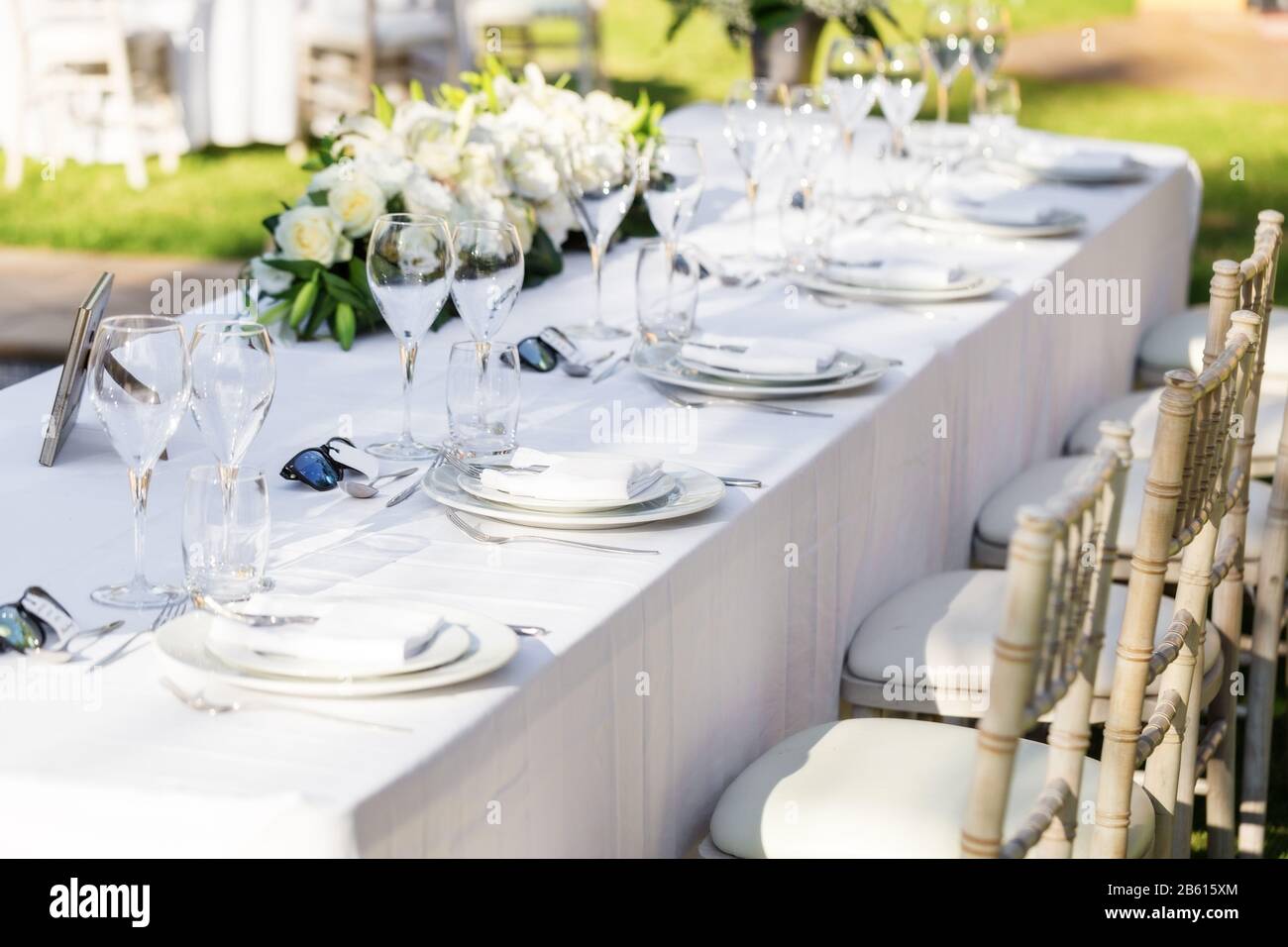 Wedding Table Decorations Close Up Flowers Plates Utensils Stock